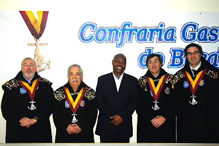 Se há surpresas na vida, o convite para participar no XVII Capítulo da Confraria Gastronómica do Bacalhau de Ílhavo, ontem, sábado,  foi uma delas. E a surpresa maior, inimaginável para mim, modesto cidadão que assim me considero neste mundo de confrarias e equivalentes, reside no facto de ter sido entronizado como Confrade de Honra. Tanta gentileza de amigos confrades sensibilizou-me, e lá fui para a festa, que o foi realmente a vários níveis. Um discurso do Grão-mestre bem concebido a abrir com arte, graça e realismo, que só lamento não o ter gravado, o convívio fraterno de diversas confrarias, todas apostadas em defender algo de típico das suas gastronomias, a Patanisca de Honra para estimular os apetites, a investidura de três Confrades de Honra, a D. Ana Maria Lopes, o Senhor João Nunes Cavaz e eu próprio, no belíssimo cenário da Faina Maior do Museu Marítimo de Ílhavo, a visita ao Aquário dos Bacalhaus, a serenata cheia de sentimento, decerto de quem alimentou saudades nos bancos de pesca ou no mar revolto, e a saída para o almoço no Hotel de Ílhavo ficaram como retrato colorido para memória futura.