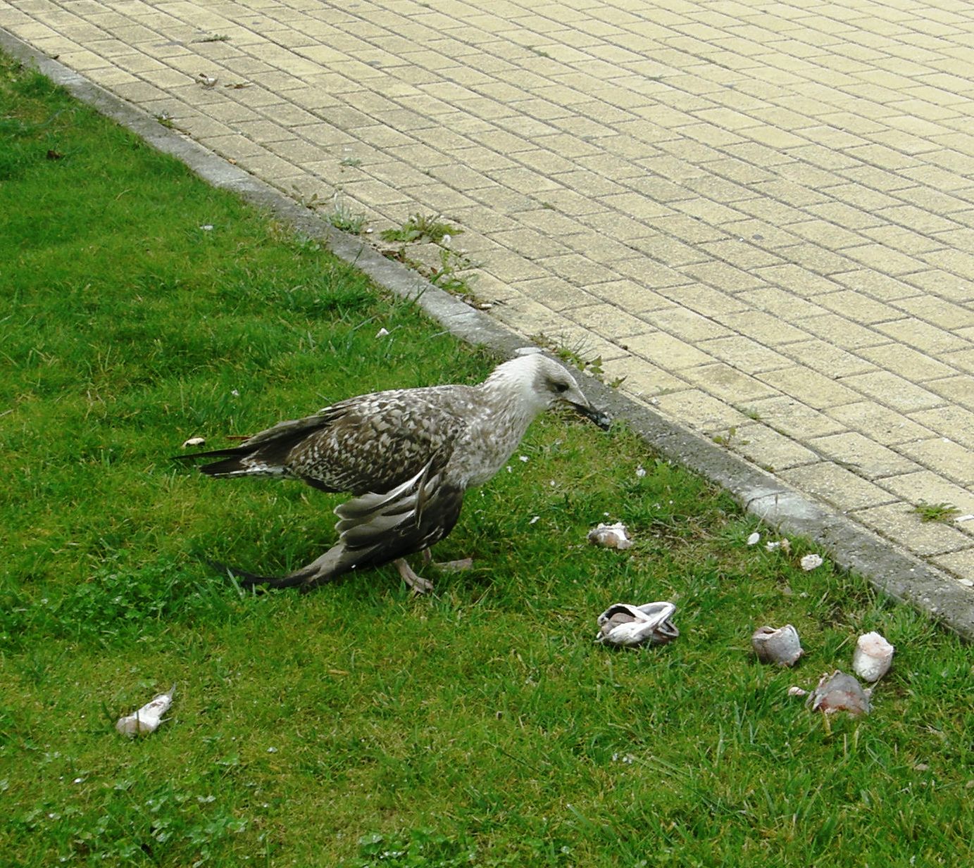 Hoje passei pelo Jardim Oudinot e deparei-me com uma cena pouco comum: um pescador preparava a refeição para uma gaivota que se apresentava diminuída. O pescador cortava uma marmota aos bocados para que a gaivota a pudesse comer mais facilmente. Então, à minha pergunta sobre o insólito da situação, o pescador contou-me a história daquela gaivota.