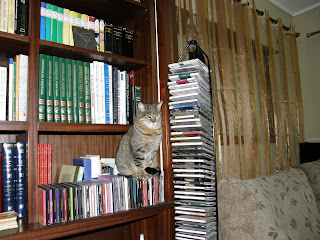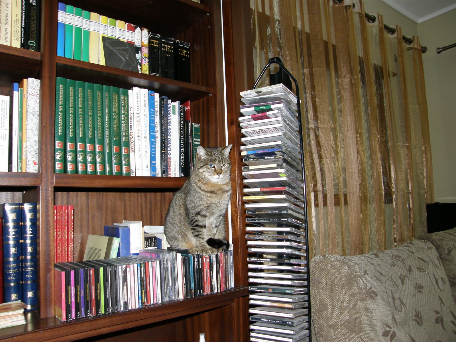 A serenidade da minha gata, a Biju cá de casa, qual guardiã atenta, está bem patente nesta foto. Postura de quem sabe que livros e música precisam de quem os guarde, na esperança de que alguém os leia e ouça.